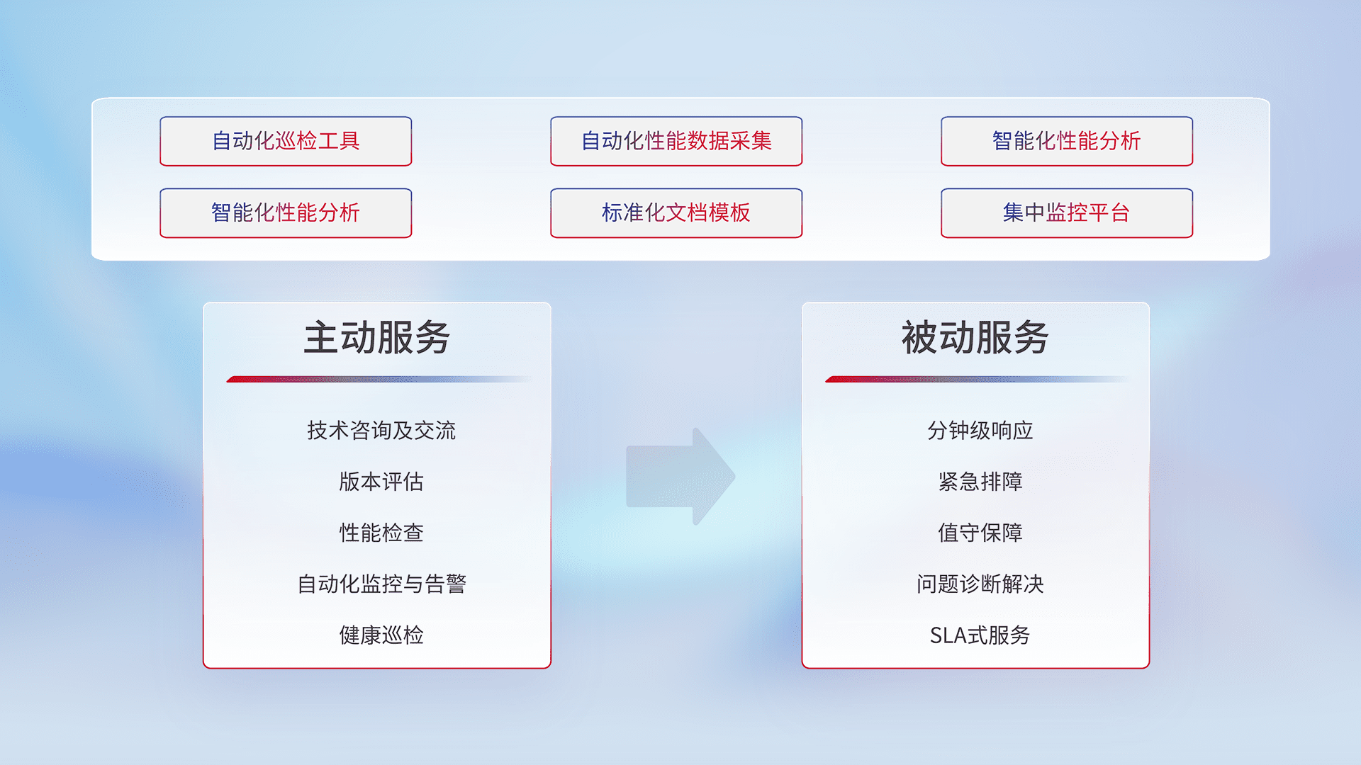 智能化工具和标准化文档,,,,保障服务质量,,提供主动服务(包含技术咨询、、、版本评估、、性能检查、、自动化监控与告警、、健康巡检)和被动服务包含(分钟级响应、、、紧急排障、、、、值守保障、、、问题诊断解决、、、、SLA服务)。。